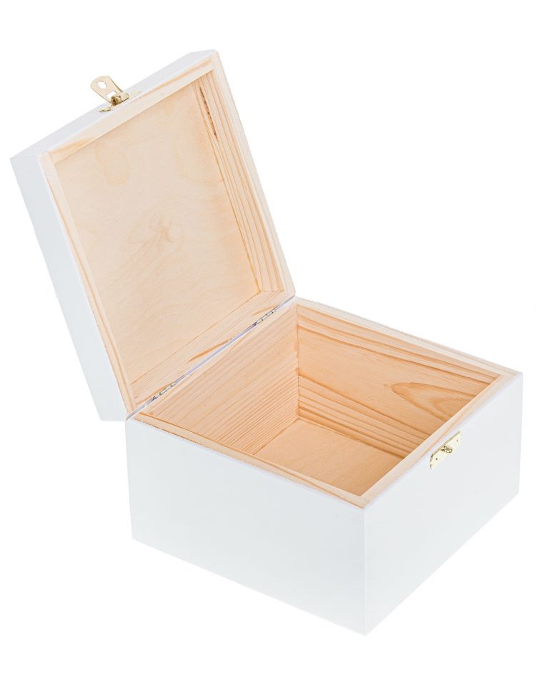 Drewniane białe pudełko na skarby z personalizowanym nadrukiem.
